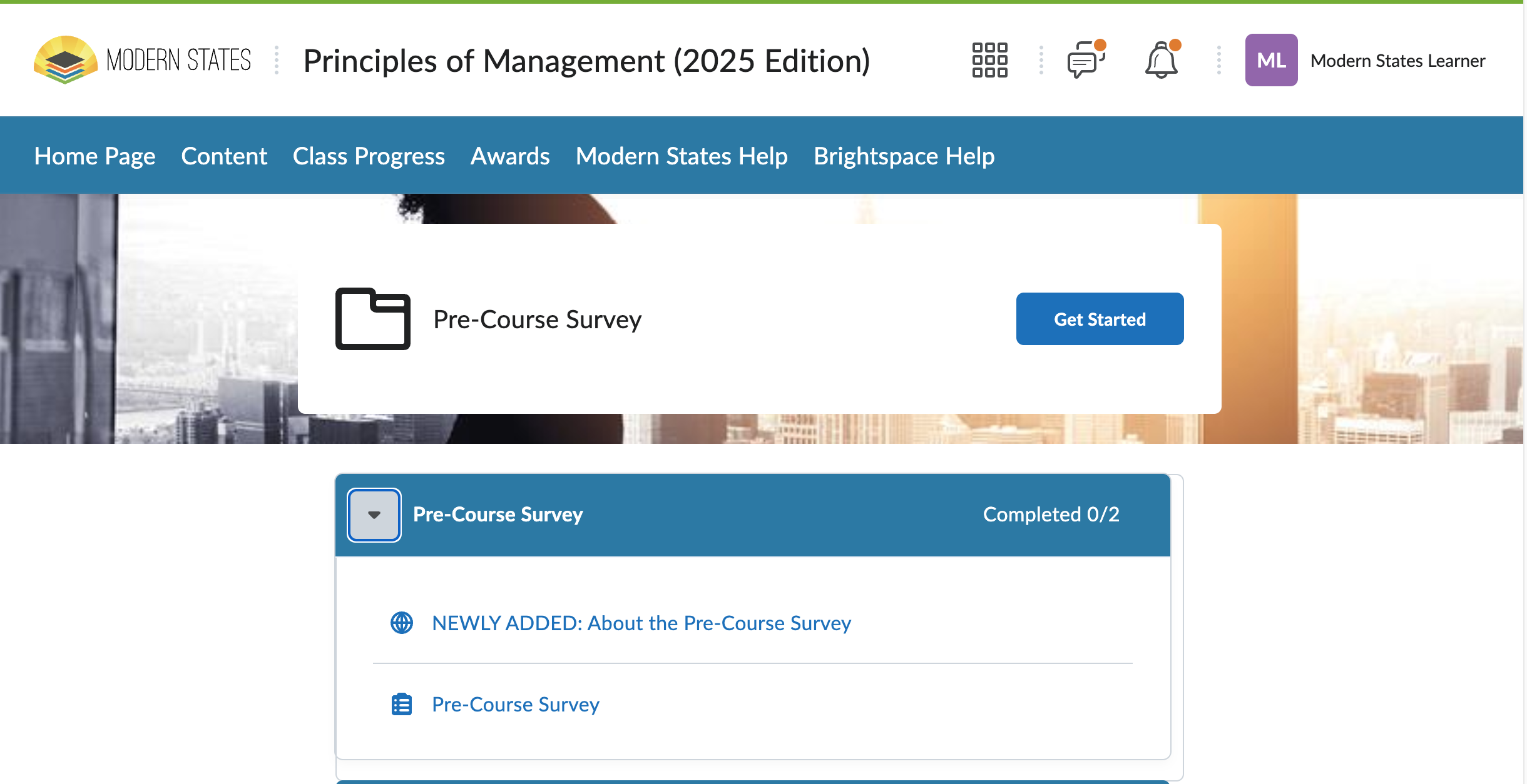 Every course begins with a Pre-Course Survey, followed by learning modules and quizzes that help you prepare for the final exam.